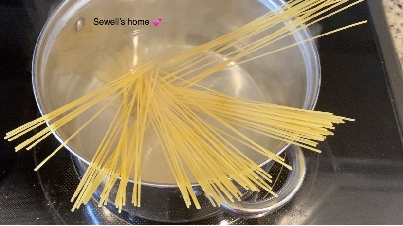 우선 냄비에 물이 끓으면 소금 한꼬집 넣고 파스타면을 집어 넣고 끓입니다 .